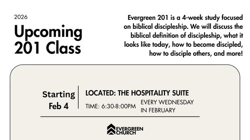 Evergreen 201 is a 4-week study focused on biblical discipleship. We will discuss the biblical definition of discipleship, what it looks like today, how to become discipled, how to disciple others, and more! Seasoned Disciple-makers from Evergreen will also be engaged with 201 as we hear their testimonies and insight. Each meeting builds on the prior meeting, so it is important to attend all 4 weeks.